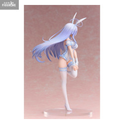 The sculpt features her flowing lavender hair with gentle gradient highlights, intense violet eyes, and a pastel blue Bunny outfit. Her ensemble includes matching bunny ears, a bowtie, puffy tail, and a delicate corset. White thigh-high stockings and heels complete the graceful, understated look.