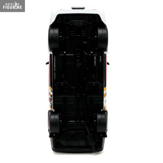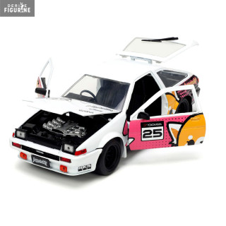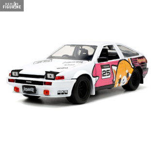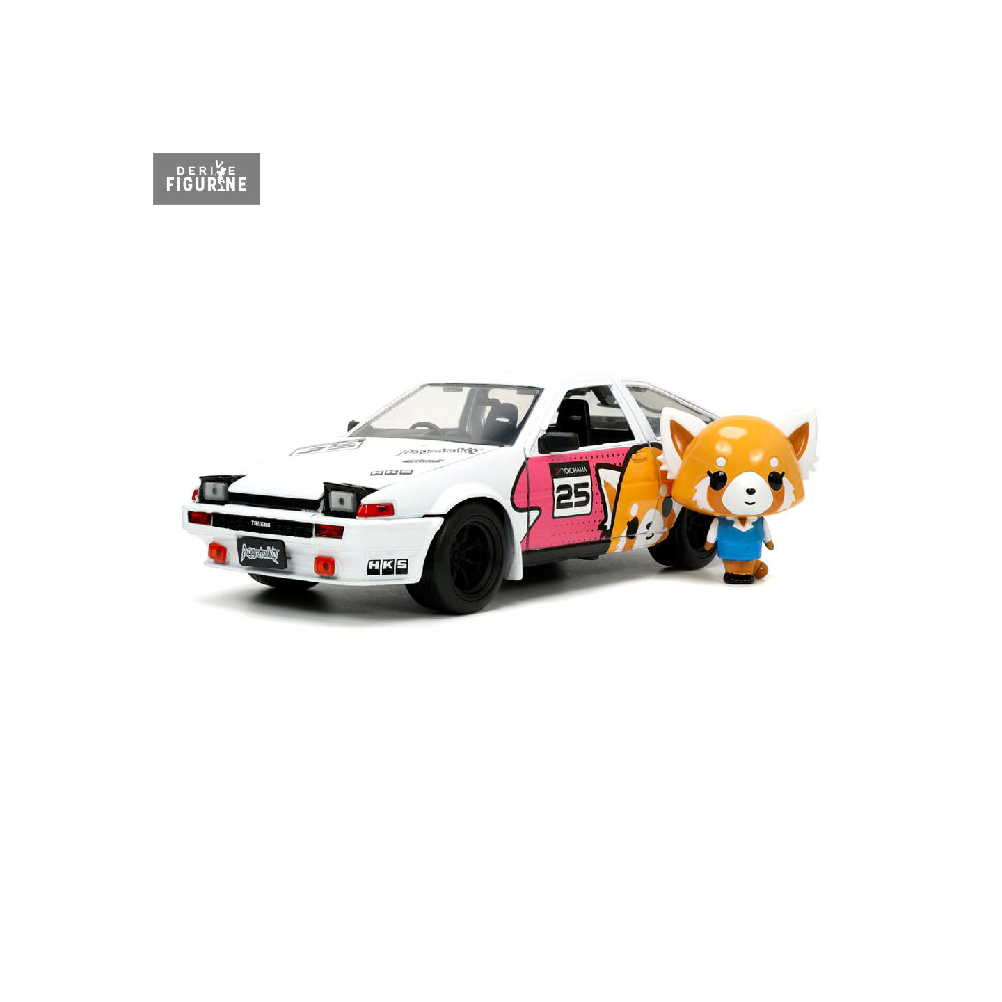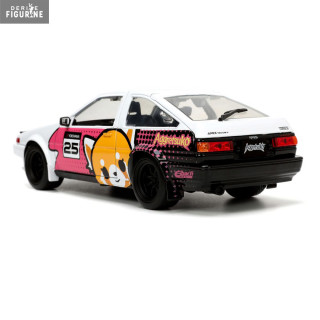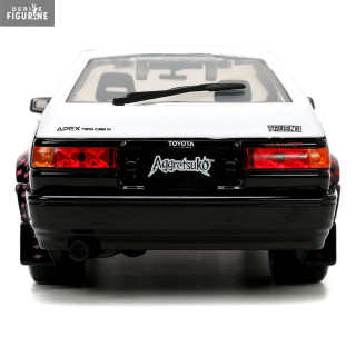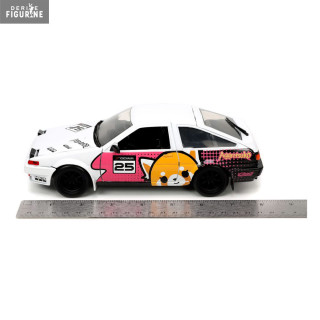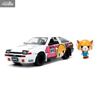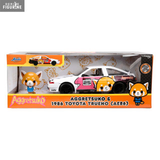 The 1986 Toyota Trueno is a car that has participated in many races and rallies. It has a robust and inexpensive body and here it is in the colors of Aggretsuko. You even have a small figurine of the red panda cub, who for once seems quite calm. You can roll it, but also open all the doors, trunk and hood.
