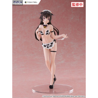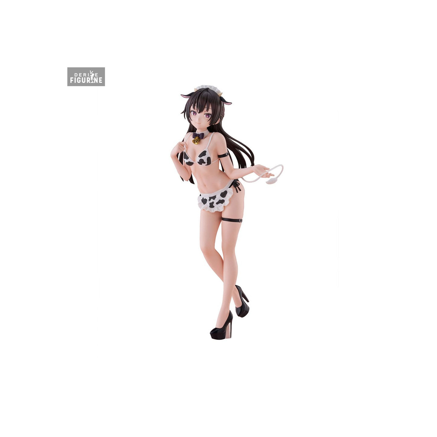 The design faithfully mirrors her anime look: long, sleek black hair frames a face with mischievous purple eyes. Her black-and-white cow-patterned bikini features frilly edges, cow ears, a pastel pink bell, and a delicately tied tail. Black stiletto heels accentuate her slender 28 cm figure, and she holds a small milk bottle, a symbolic accessory of her attire.