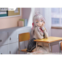 Her design is faithfully recreated: long silver hair tied with a red ribbon, classic school uniform with a beige sweater, black pleated skirt, and white thigh-high socks. The included desk and chair are sculpted with realism, completing the scene.