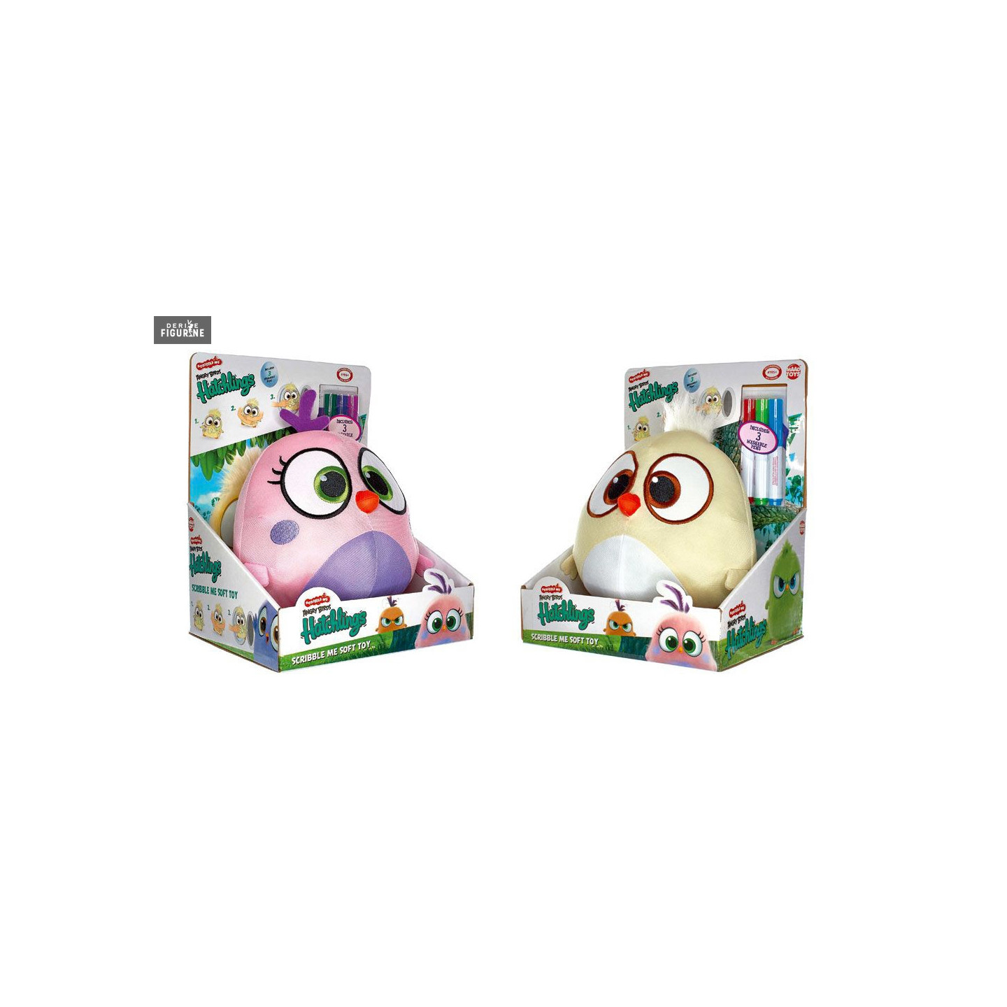 The Angry Birds also have children and the two stuffed animals that you have in front are precisely. These Hatchlings are also a bit special, because there are three felts provided with it. The principle is to customize them as you want with these pens and when you're fed up or there is more room, a simple machine tour will make it like new.