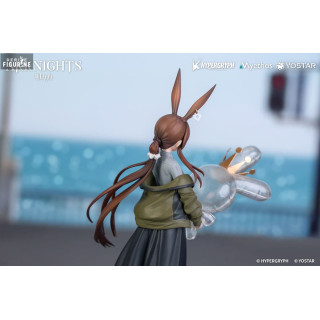 One of the most remarkable aspects of this figure is the attention to detail. Amiya’s face is expressive, with her large blue eyes and delicate smile, reflecting her sweet but resolute personality. The folds of her outfit, the textures and accessories, such as the small transparent plush bunny she holds in her arms, are meticulously crafted, offering exceptional visual quality.