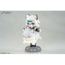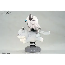 Visually, she’s shown in a super-deformed style with long white hair and light grey animal ears. A small headband across her forehead features blue beads, and her eyes are half-lidded in a very “unimpressed” look. She’s perched on a round, chibi white creature with pale grey spots, sleepy eyes, and raised paws, all mounted on a black spring attached to a grey base, giving it that signature “shake” display effect.
