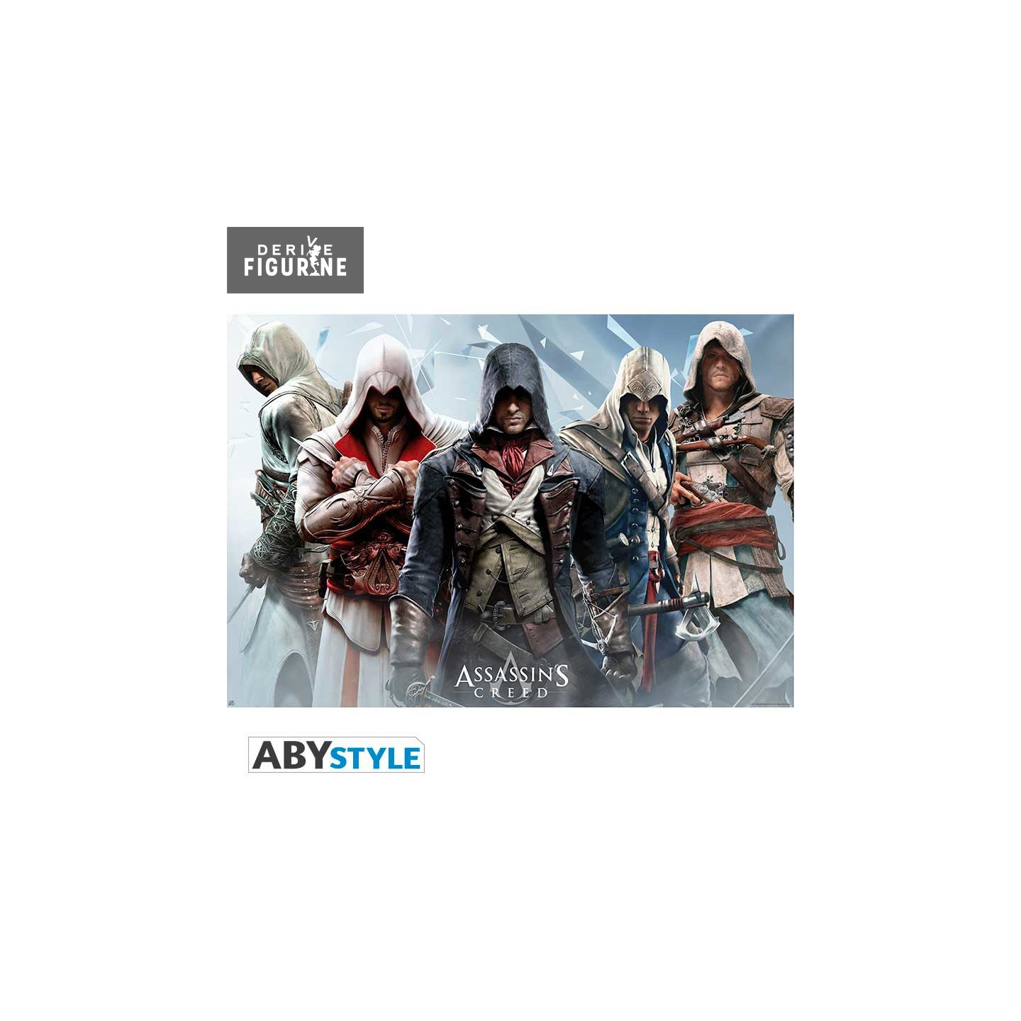 Here is a poster that takes up the heroes of the different opus of the Assassin's Creed game. So we have Altair Ibn La-Ahad, Ezio Auditore da Firenze, Arno Victor Dorian, Connor and finally Edward Kenway. A beautiful skewer of assassins