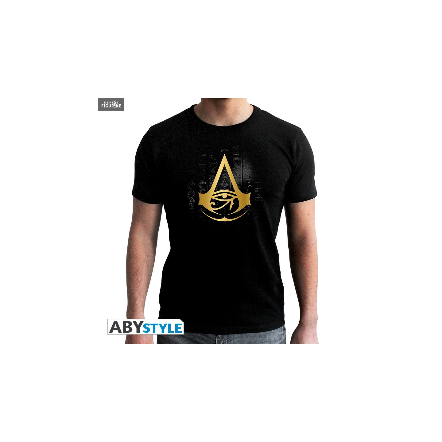 If you like the Assassin's Creed series and more specifically the Origins opus, here is a t-shirt that should please you. It takes again the emblem of the Assassins in golden color and with hieroglyphs in bottom.