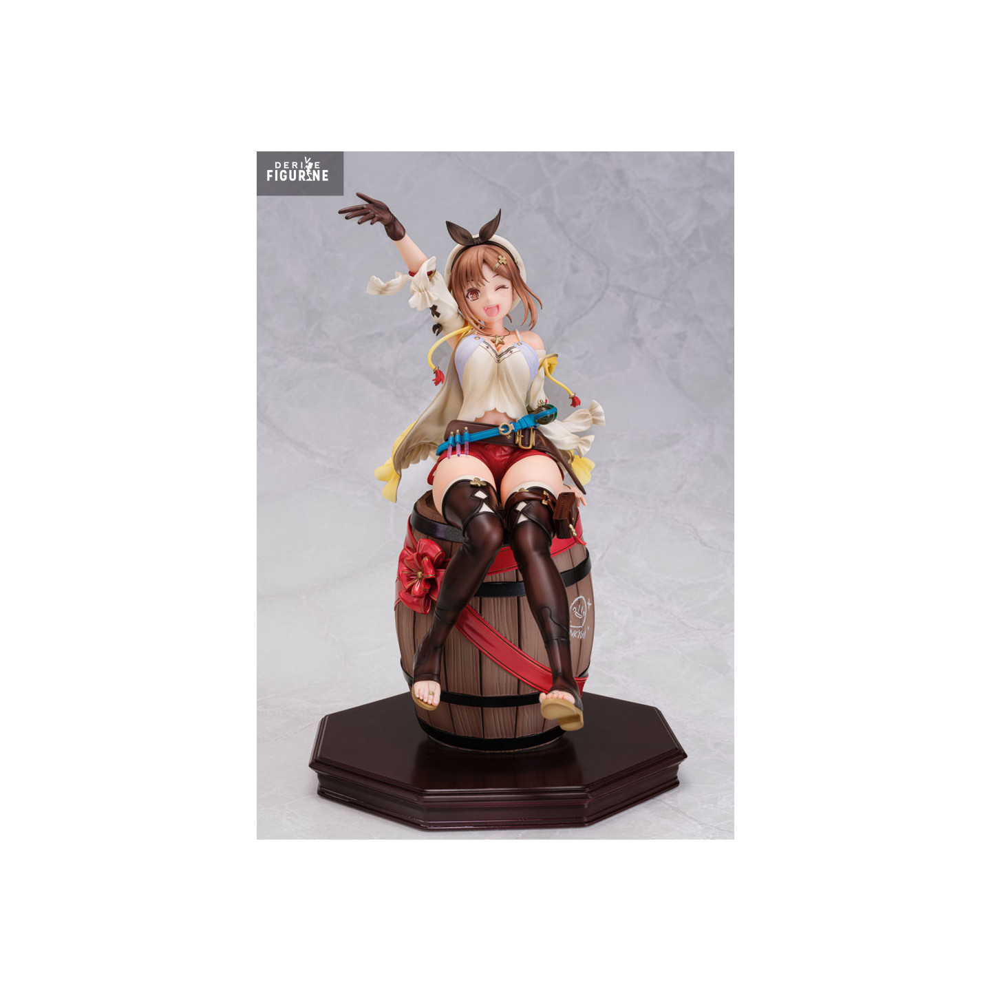 Reisalin “Ryza” Stout shines in this official AmiAmi figure commemorating the Atelier Series 25th Anniversary. Standing approximately 22 cm tall at 1/7 scale, it captures Ryza perched on her trusty barrel, arm raised triumphantly as she unveils the legendary Great Cabinet.