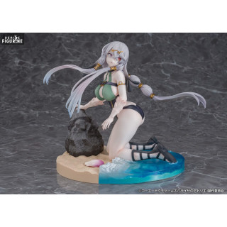 The figure portrays Lila kneeling on a beautifully detailed beach scene, with a rock beside her and intricately sculpted transparent waves adding realism to the setting. Her swimsuit accentuates her athletic build, while her golden accessories enhance her unique and sophisticated style. The fine details in her silvery hair and confident expression highlight the artisanal craftsmanship of the manufacturer.