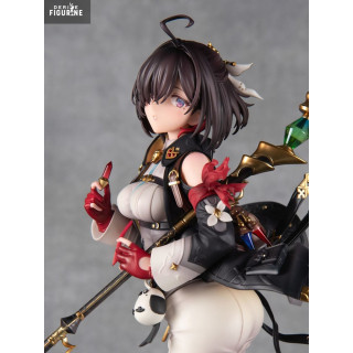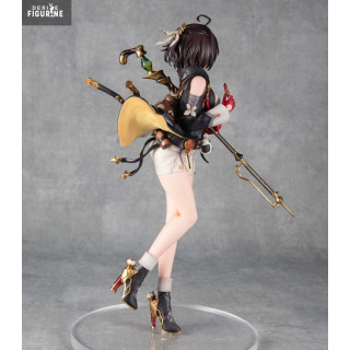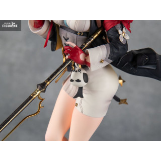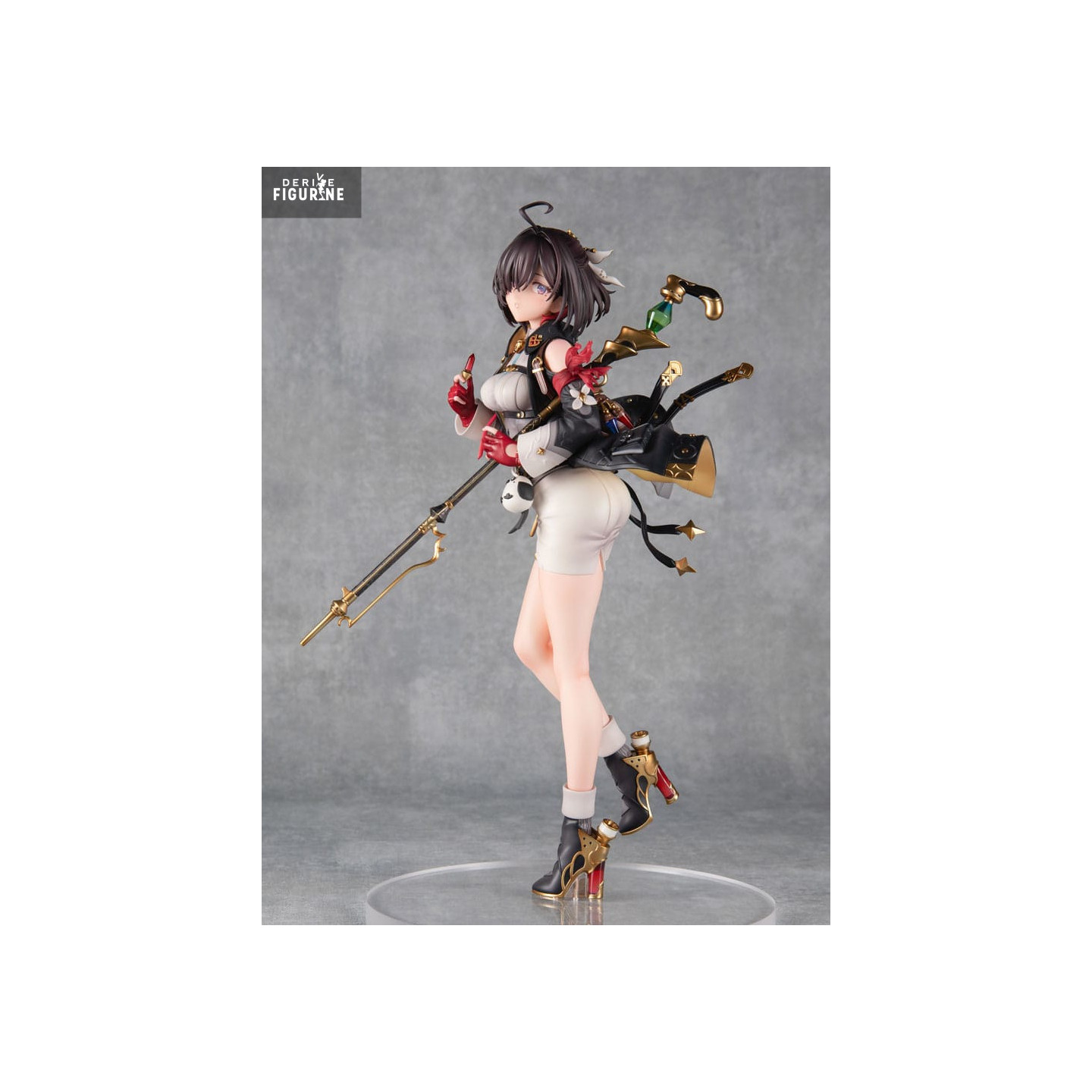 This PVC figure, standing at 25 centimeters tall at a 1/7 scale, captures Yumia in a dynamic and elegant pose. Her outfit reflects the alchemy-themed world, featuring various materials and colors, perfectly embodying her determined and mysterious character. The manufacturer, Koei Tecmo, has meticulously recreated every aspect of her attire, including the intricate details of her corset, the patterned belt, and the grand coat she drapes casually over her shoulders. The figure also includes Yumia's signature weapon, a staff adorned with engravings, highlighting her status as a skilled alchemist.