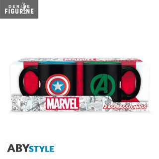 Marvel ceramic mini-mug pack. They have a capacity of 11 cl and can be microwave and dishwasher safe. The manufacturer is ABYstyle.