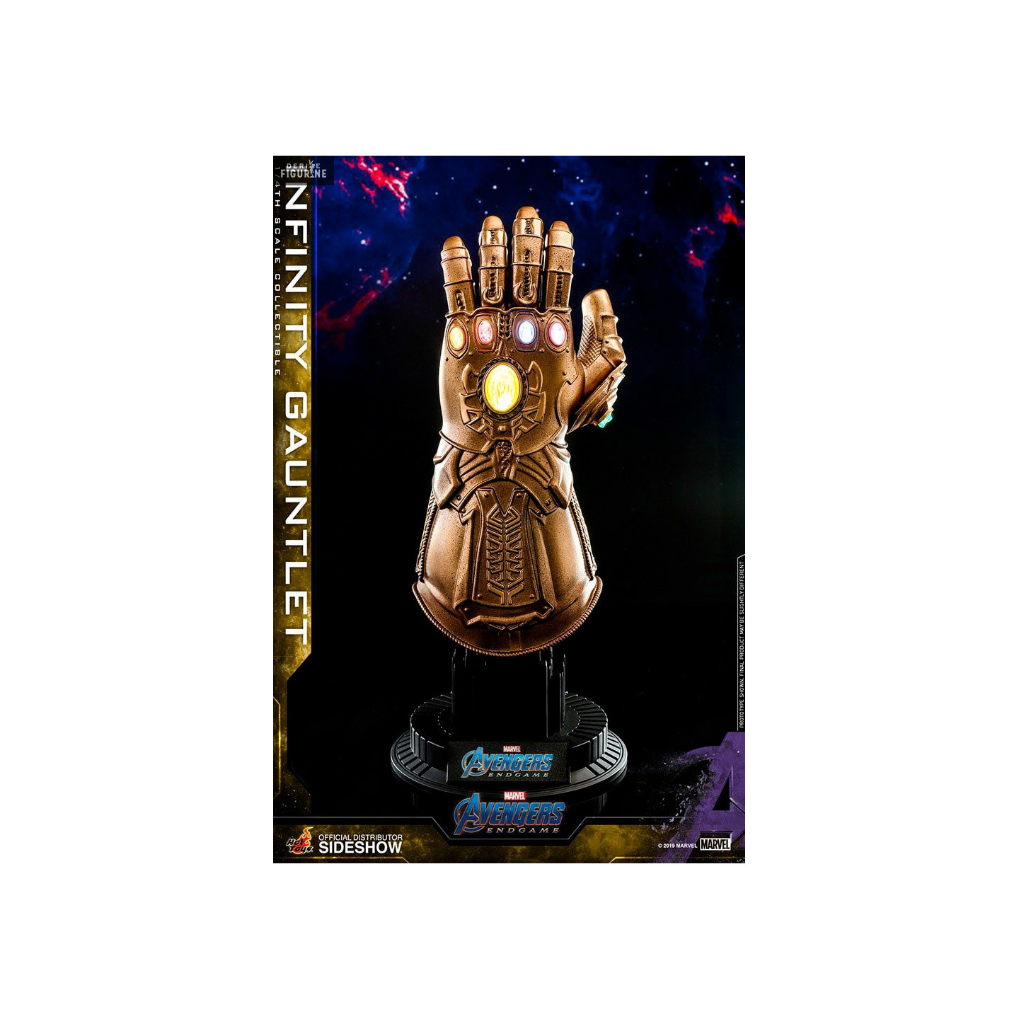 Official Infinity Gauntlet replica which measure approxatively 17 centimeters (23 with stand) with lightning functions to scale 1/4. The manufacturer is Hot Toys.