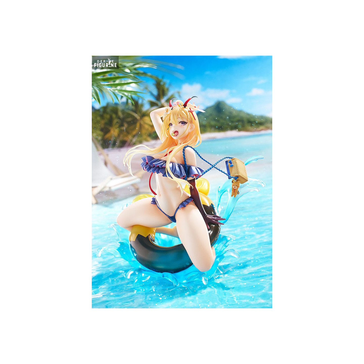 With her brightly colored beachwear, Kumano captures the essence of summer relaxation. Her midnight blue swimsuit accented with deep red ruffles highlights the delicate paleness of her skin, while the golden touches add a touch of elegance to her casual outfit. Her blonde hair, dotted with marine accessories, floats carefreely in the wind, reflecting the movement of the waves on which she seems to be sailing.