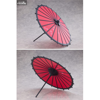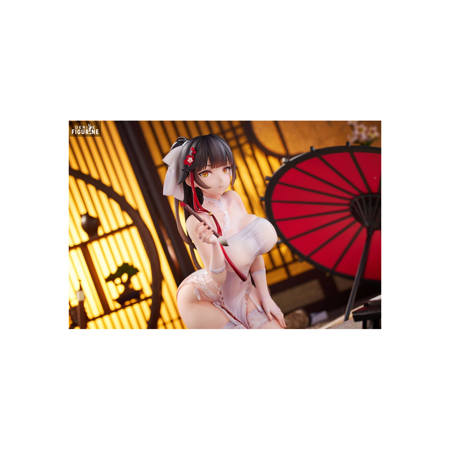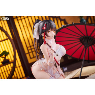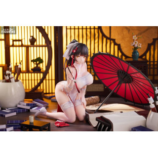 The Takao figure from the Azur Lane universe offers an elegant and captivating interpretation of the character, perfect for discerning collectors. Takao is presented in a kneeling pose, wearing a traditional white outfit that highlights her graceful curves. Her soft and slightly mysterious expression, combined with her captivating gaze and long black hair adorned with white ribbons, enhances her refined charm. Beside her, a large red parasol adds an authentic Japanese touch, elevating the scene’s overall aesthetic.
