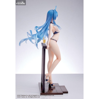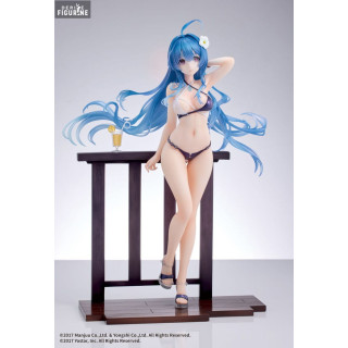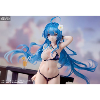 The figure captures Helena in a graceful pose, playing with her flowing blue hair adorned with a delicate flower that enhances her charm. The violet swimsuit, exquisitely detailed, emphasizes her harmonious curves. The wooden base, accompanied by a decorative glass, creates a tropical and refined atmosphere, transporting fans to a sunlit paradise.