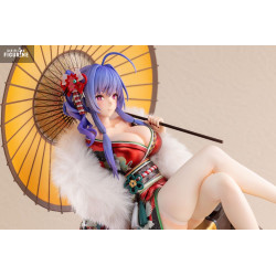 This Spirits in the Snow version portrays her in a festive, New Year-inspired style. Seated gracefully on a wooden platform, she holds a long cigarette holder while gazing softly ahead, as if caught in a serene moment. The scene is enhanced by the large traditional Japanese parasol behind her.
