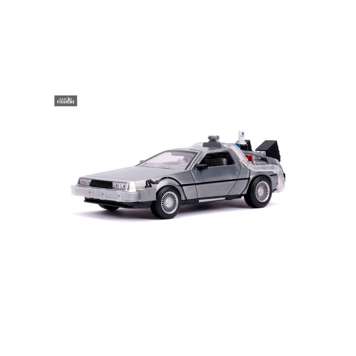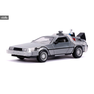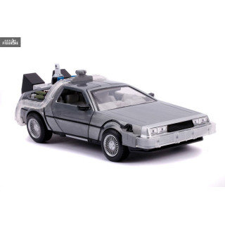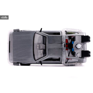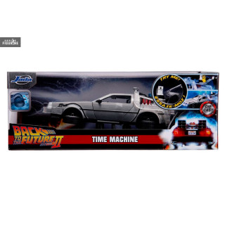 Official replica of the DeLorean in die cast and injected plastic measuring approximately 18 centimeters long, scale 1/24. The manufacturer is Jada Toys.