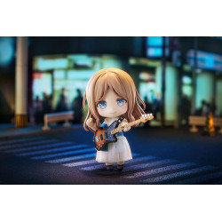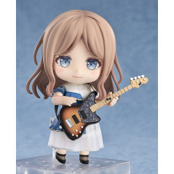 In terms of design, the Nendoroid shows her long wavy light-brown hair framing her face, her large blue-violet eyes and a faint blush on her cheeks. She wears a light white dress with a flowing skirt, covered by an asymmetrical blue overskirt with a belt and a small silver chain, completed by black strap shoes. Her instrument has an offset body with a sunburst finish, a speckled black pickguard and clearly sculpted control knobs, attached to a dark strap. The various arms and facial expressions let you create many poses, and the clear Nendoroid base keeps her stable in any display.