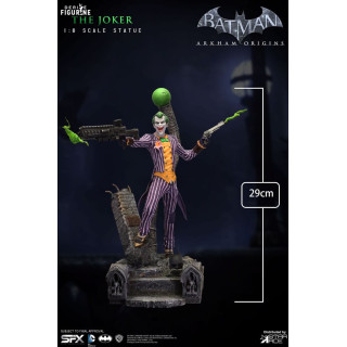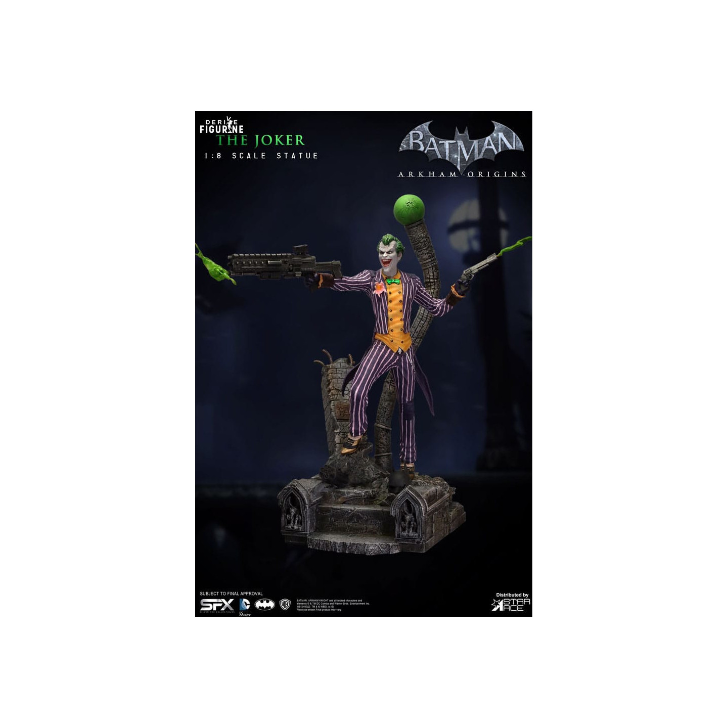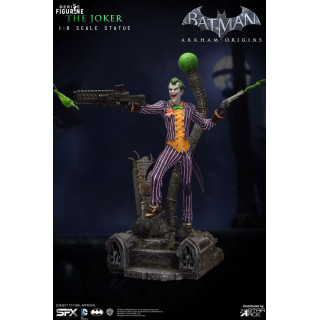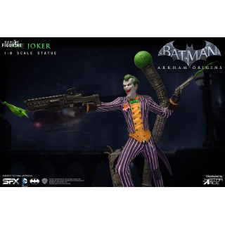 The Joker, Batman's nemesis, is depicted here in all his evil glory, wearing his signature purple-striped suit and sporting his legendary, sinister smile. The figure perfectly captures the character's chaotic and unpredictable spirit, with intricately sculpted details that pay homage to his appearance in the game "Arkham Origins." From the features of his face to the folds of his costume, each aspect is worked to offer impressive realism.