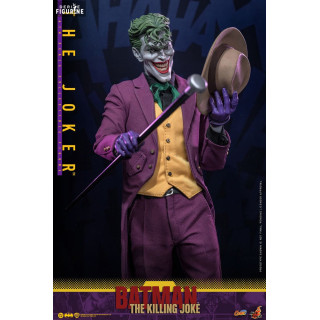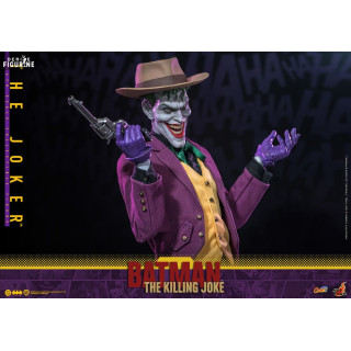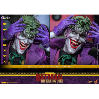 The Clown Prince of Crime appears here in his signature purple coat, yellow vest, and green shirt. His pale face with blood-red lips is recreated with striking precision, including interchangeable expressions and even a detachable tongue for varied posing. The camera he holds directly references the key scene from The Killing Joke, reinforcing the faithful connection to the source material.