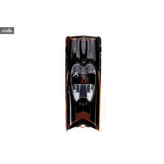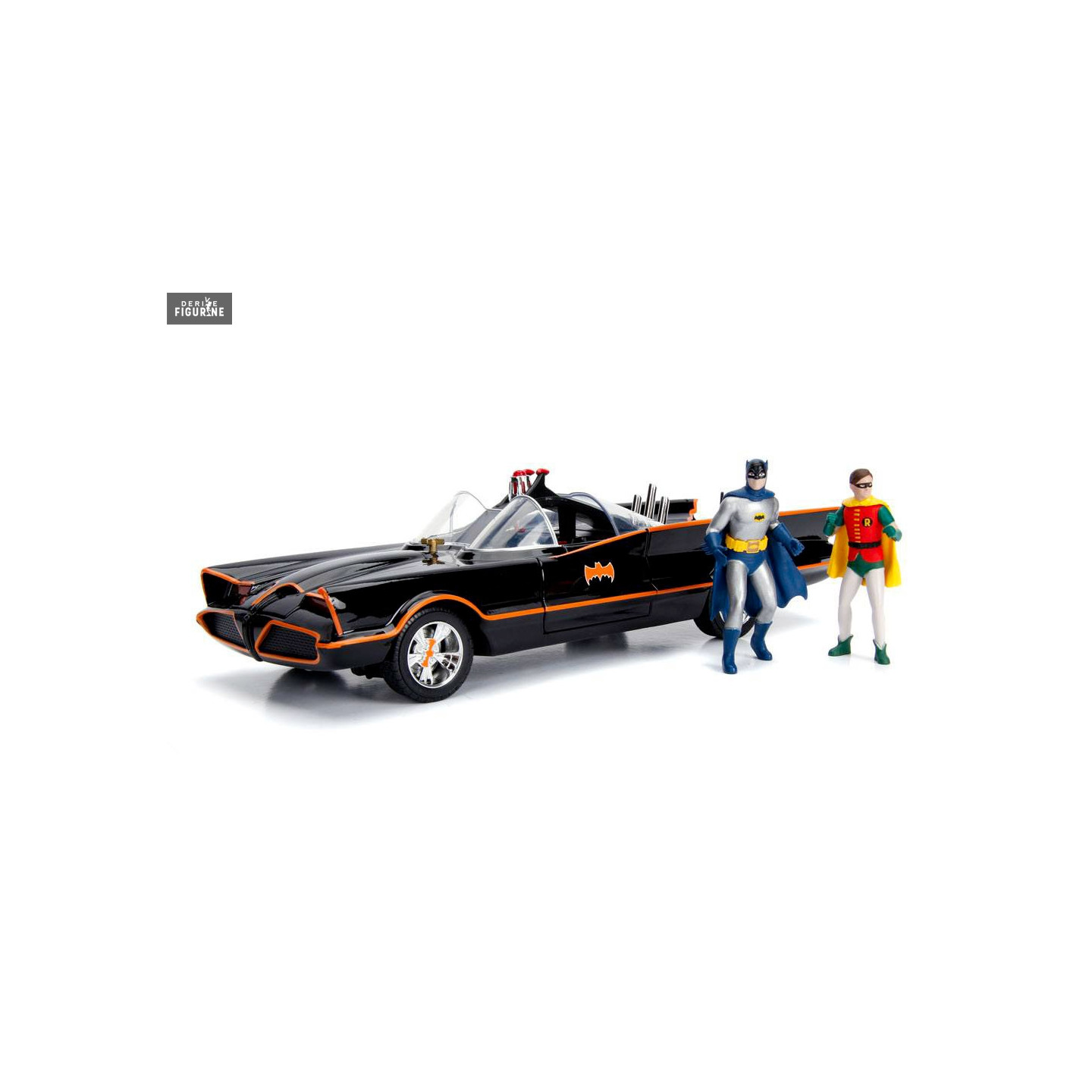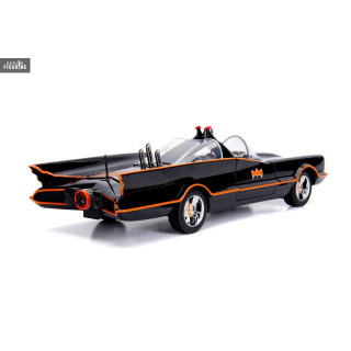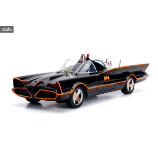 Official replica of Batmobile with figures Batman and Robin, 1966 in metal die cast and injected plastic 1/18 scale with LED functions. The manufacturer is Jada Toys.
