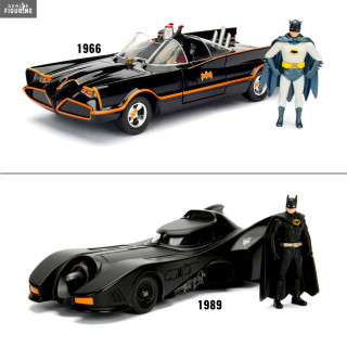 Official figures of Batman and his Batmobile of your choice between the version 1966 or the 1989 in die cast, scale 1/24. The manufacturer is Jada Toys.