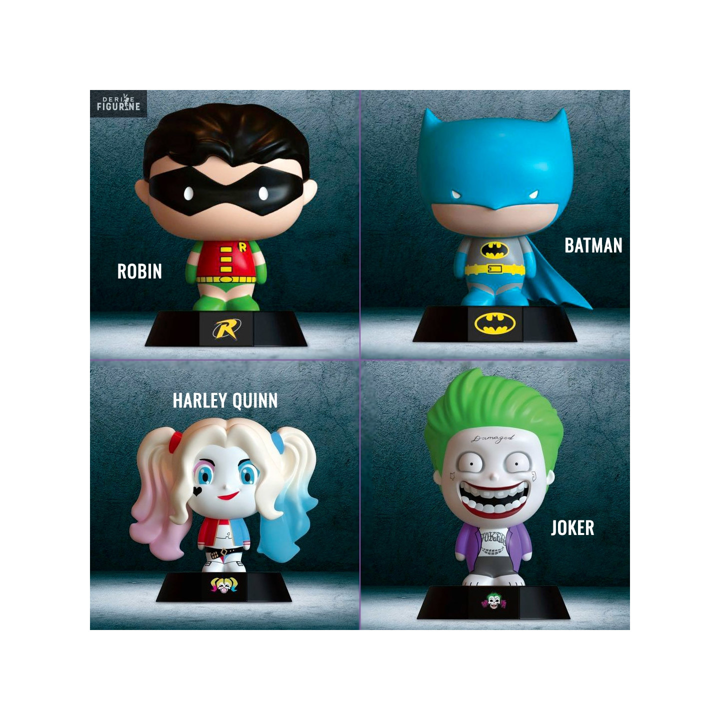 Official night light of your choice between Robin, Batman, Harley Quinn or The Joker, measuring about 10 centimeters high. Requires two AAA batteries (not included). The manufacturer is Paladone.