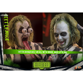 Played by Michael Keaton, Beetlejuice is a chaotic and eccentric character summoned by the dead to scare the living out of their homes. With his iconic black-and-white striped suit, pale complexion, and wild green hair, this figure recreates every iconic detail of the character. This 1/6 scale model goes even further, offering interchangeable heads with different expressions, movable eyes to adjust his eerie gaze, and realistic wool hair to enhance authenticity.