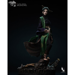 The figure’s design stays true to her in-game appearance: a long green sleeveless tunic split at the sides, wide black sleeves, textured brown trousers, and open-toe sandals. Her black hair is styled into two traditional buns, accented with thin golden pins. Her facial expression is serene, almost unreadable, amplifying her mysterious aura. The sculpted base, resembling cracked stone terrain, grounds the character in the mythic world she inhabits.