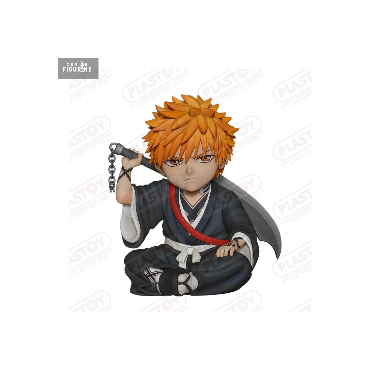 The figure shows him seated cross-legged, wearing his black Shinigami uniform tied with a white obi. His spiky orange hair contrasts with the serious expression on his face. He holds his large sword by the chain, resting it on his left shoulder, adding a touch of casual control to the scene. The folds in his clothing, relaxed posture, and detailed weapon faithfully capture his iconic look.