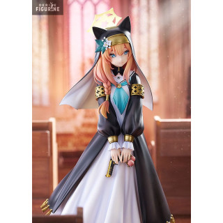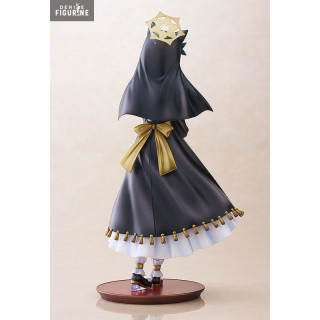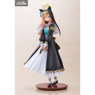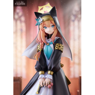 Dressed in a long white robe adorned with a black monastic scapular and a golden cross harness, Mari exudes a magical aura. Her accessories, such as golden headbands and ribbons, emphasize her elegance. The figure highlights the subtle details of his appearance, including his fox ears and mesmerizing sky blue eyes.