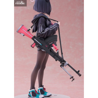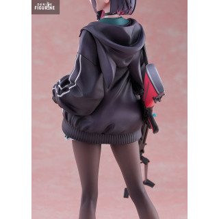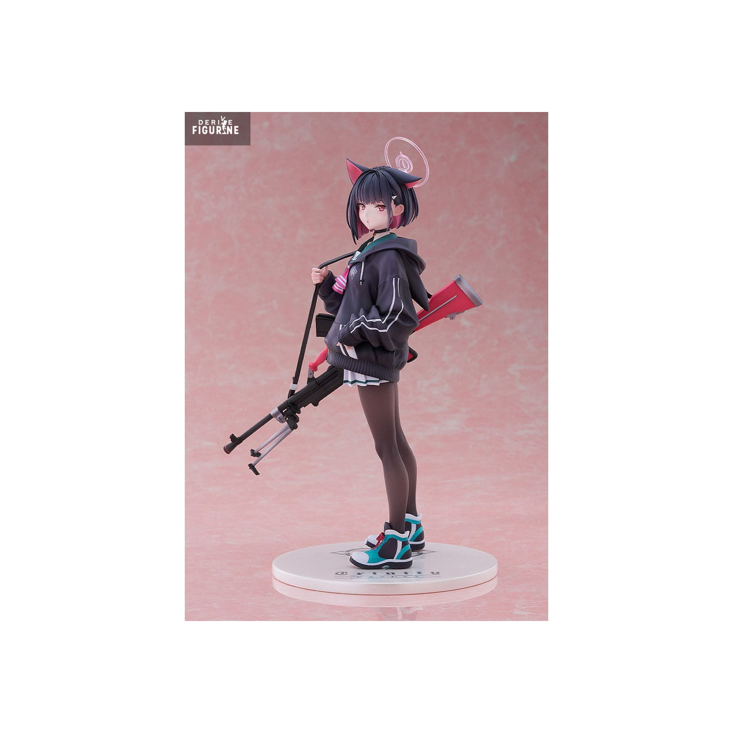 This 24 cm statuette captures every facet of her signature style. The black hoodie with bold white stripes contrasts strikingly with her short pleated skirt and opaque tights. Cat-ear headphones, a spiral-patterned halo, and her matte red precision rifle strike the perfect balance between softness and lethality. Teal-and-black low-top sneakers inject dynamism into her stance, while her determined gaze peers out from beneath a carefully sculpted fringe.