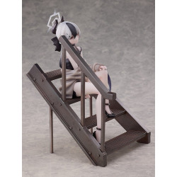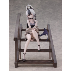 Visually, she’s seated on a dark stair-step structure, one leg tucked in while the other extends down, with one hand lifted near her face. She wears a black dress with a sleek silhouette, and a light-colored shawl/coat is draped loosely around her arms. Her hair is short in a grey/white tone with a darker front streak, and there’s an angular head accessory above her hair that gives a sharp, stylized touch. A dark navy tail with bold white shapes sits behind her, along with a choker and black ankle-strap heels. The stairs base makes the whole scene feel stable and easy to display without needing extra scenery.