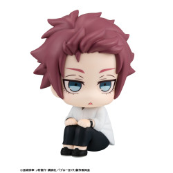 Design-wise, his look stays clean and understated. Sae wears a loose white long-sleeved shirt with an open collar, paired with simple black trousers and black shoes. His reddish-brown hair is sculpted in thick, tousled strands with a fringe framing his forehead. The pale blue eyes stand out against his calm face, emphasized by dark lashes and reddish brows that reinforce his tired, disinterested expression. Sitting with his legs folded and hands clasped in front, the figure is naturally stable on any flat surface, making him easy to display alongside the other Blue Lock characters in the Look Up series.