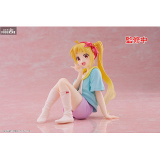 The figurine shows Nijika seated, with a broad smile and a relaxed posture, creating a friendly and warm atmosphere. Her blonde hair, tied in a high ponytail, is sculpted with great precision, capturing its natural fluidity. The bright colors of her clothes contrast pleasantly with the softness of her expression and the simplicity of the pose.