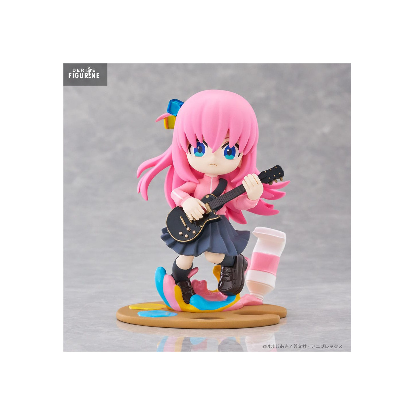 This figure from the PalVerse collection portrays Bocchi in an iconic pose, holding her guitar, with a slightly anxious expression, true to her introverted nature. Her school uniform, consisting of a pink jacket and pleated skirt, is meticulously reproduced with fine details. Her black guitar, her favorite instrument, is also perfectly depicted, emphasizing her role as the band's musician. The base, decorated with splashes of colorful paint, reflects the creative and unique atmosphere of the series.