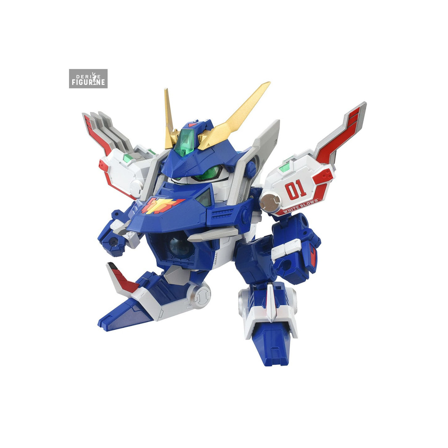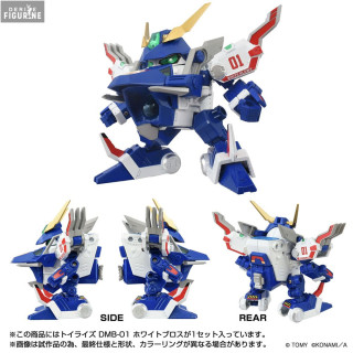 The DMB-01 White Brothers is an iconic mecha from B-Daman Bakugaiden, a spin-off series of the Bomberman universe that reimagines the beloved characters in a world of robotic battles and energy ball-shooting duels. In this universe, heroes pilot powerful machines known as B-Daman, which combine mechanical strength and speed to take on formidable opponents. White Brothers, with its striking blue, white, and gold design, is one of the most recognizable models in the franchise, often associated with intense duels and impressive combat abilities.
