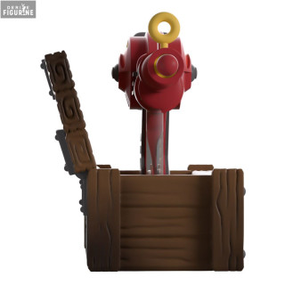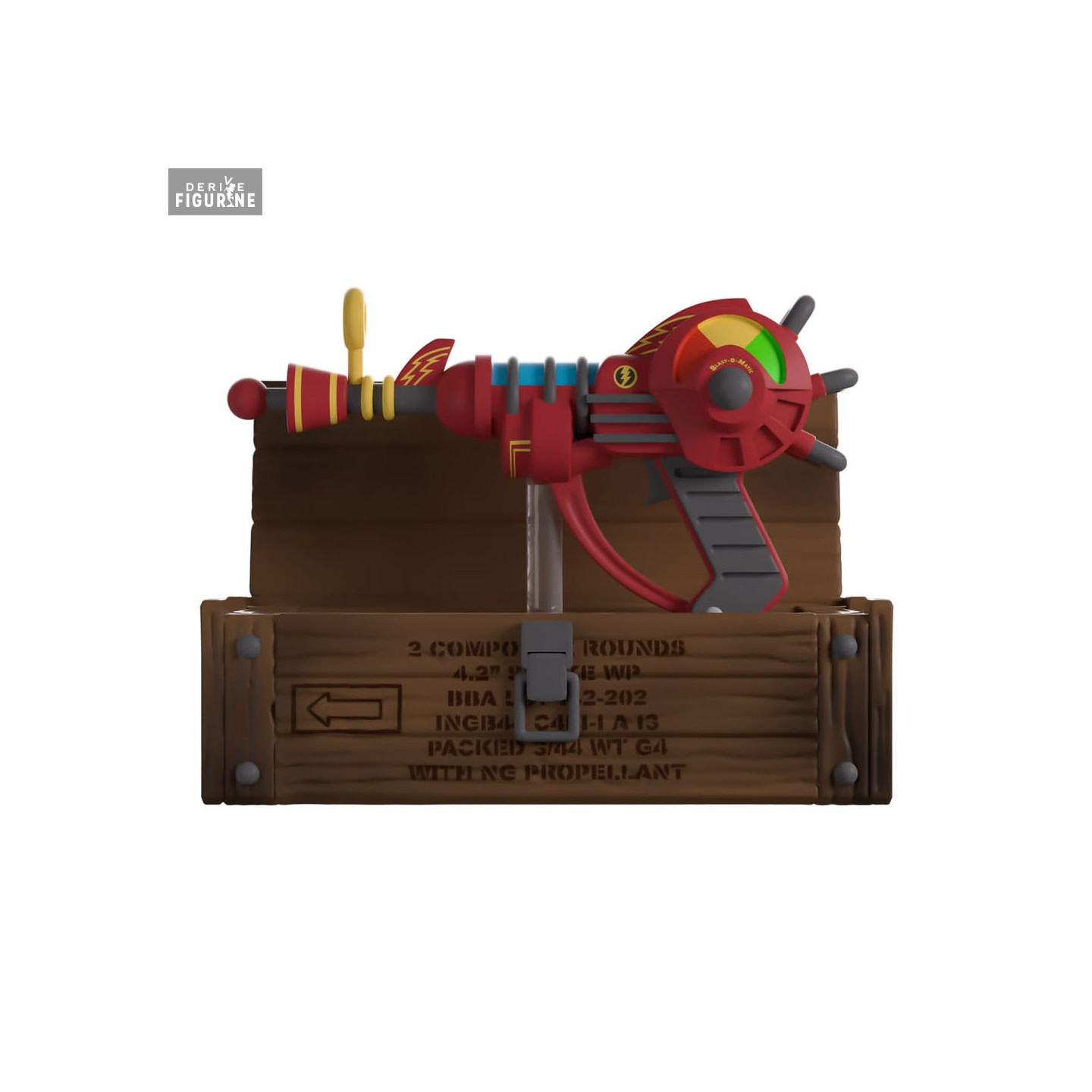 The design captures the in-game essence perfectly: a vivid red body accented with gray details, a circular power chamber graduated in green to hint at its residual energy, and a stylized barrel echoing 1950s pulp inventions. The military-stamped wooden crate adds an air of authenticity, as if you just salvaged it from an abandoned battlefield.