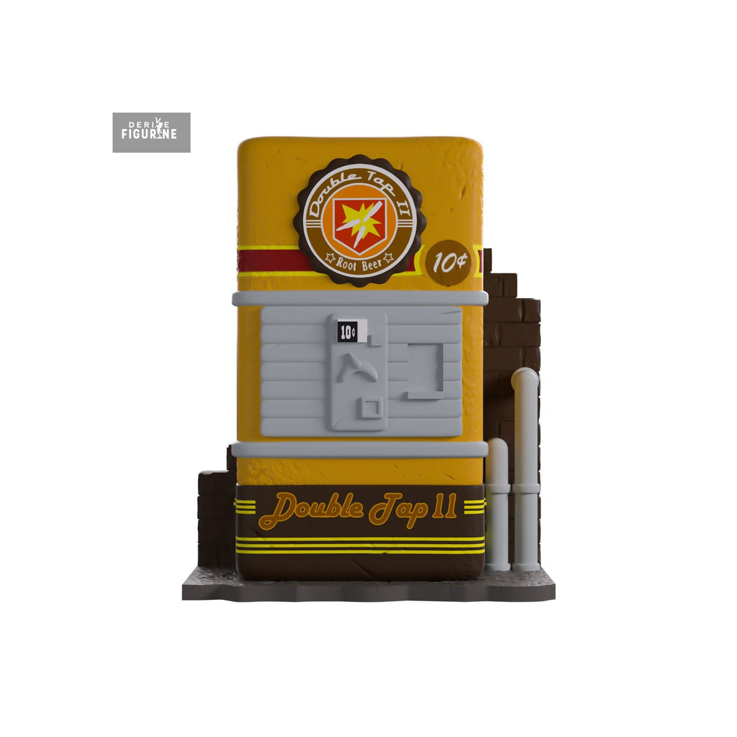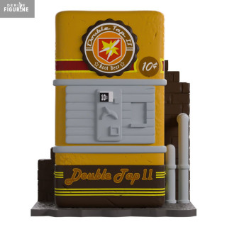 The dispenser is depicted with its bright yellow front, featuring the Double Tap II logo and the 10-cent price tag. Molded details replicate the characteristic slots, levers, and controls, while the base and sides display a brick-and-pipe structure reminiscent of its in-game setting.