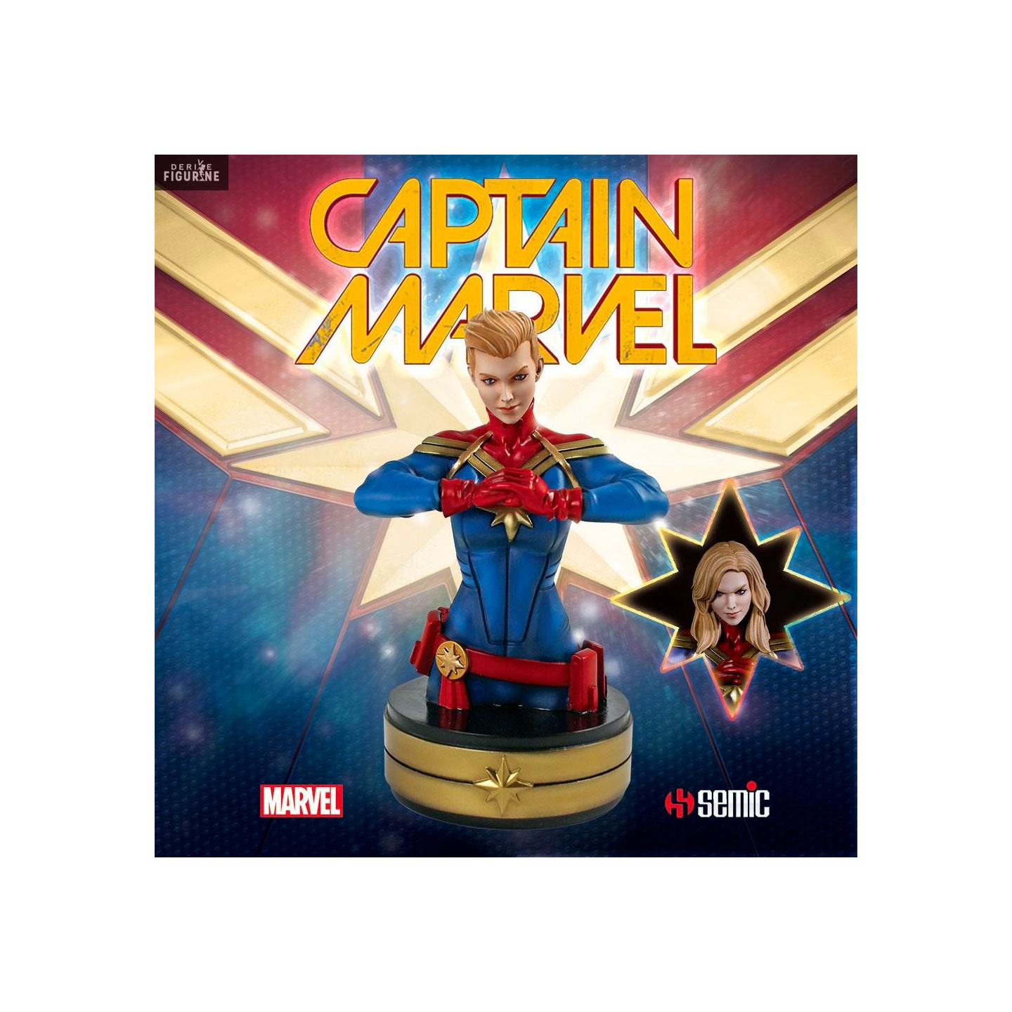 Official bust of Captain Marvel in resin which measures about 20 centimeters high. The manufacturer is Semic.