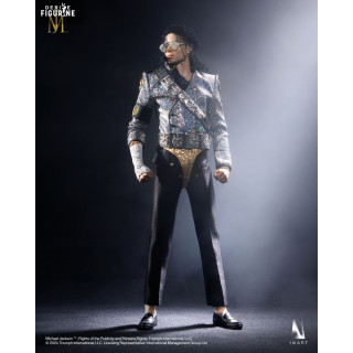 Wearing his signature sparkling jacket with a silver strap, black pants with gold trim, and black loafers, Michael strikes a poised, focused stance. The likeness is striking, with curly hair and an intense gaze. Every detail reflects his one-of-a-kind stage presence.