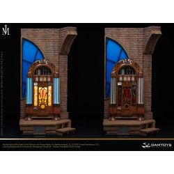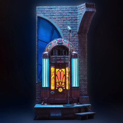 Outfit-wise, he’s wearing a finely pinstriped white three-piece suit, bright blue shirt, matching tie and a blue armband on his sleeve. The white fedora with dark band tilts forward to shade his face, while his hair falls down over his shoulders. On his feet are black-and-white two-tone shoes. The backdrop piece recreates a brick wall with an arch, plus a detailed jukebox with glowing vertical columns and a colorful front, a standing microphone and a small step at the base. Everything sits on a rectangular platform that makes it feel like you’ve got a tiny piece of the Smooth Criminal stage set in your display.