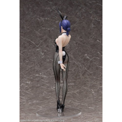 In terms of sculpt, the figure highlights a glossy black bunny suit that fits closely to her body, paired with the classic white collar and small bow tie plus matching cuffs on her wrists. Reze’s long legs are wrapped in realistic fishnet-style stockings, a hallmark of FREEing’s bunny figures, and end in high-heeled black pumps that further emphasize her height and posture. Her dark bluish-purple hair is tied back while a few strands fall around her face, and tall black bunny ears rise above her head to complete the look. The gentle curve of her back and hips creates a smooth, elegant line that shows off the costume, and the simple base keeps the focus on Reze herself, making her easy to display as a standout piece in any Chainsaw Man or bunny figure collection.