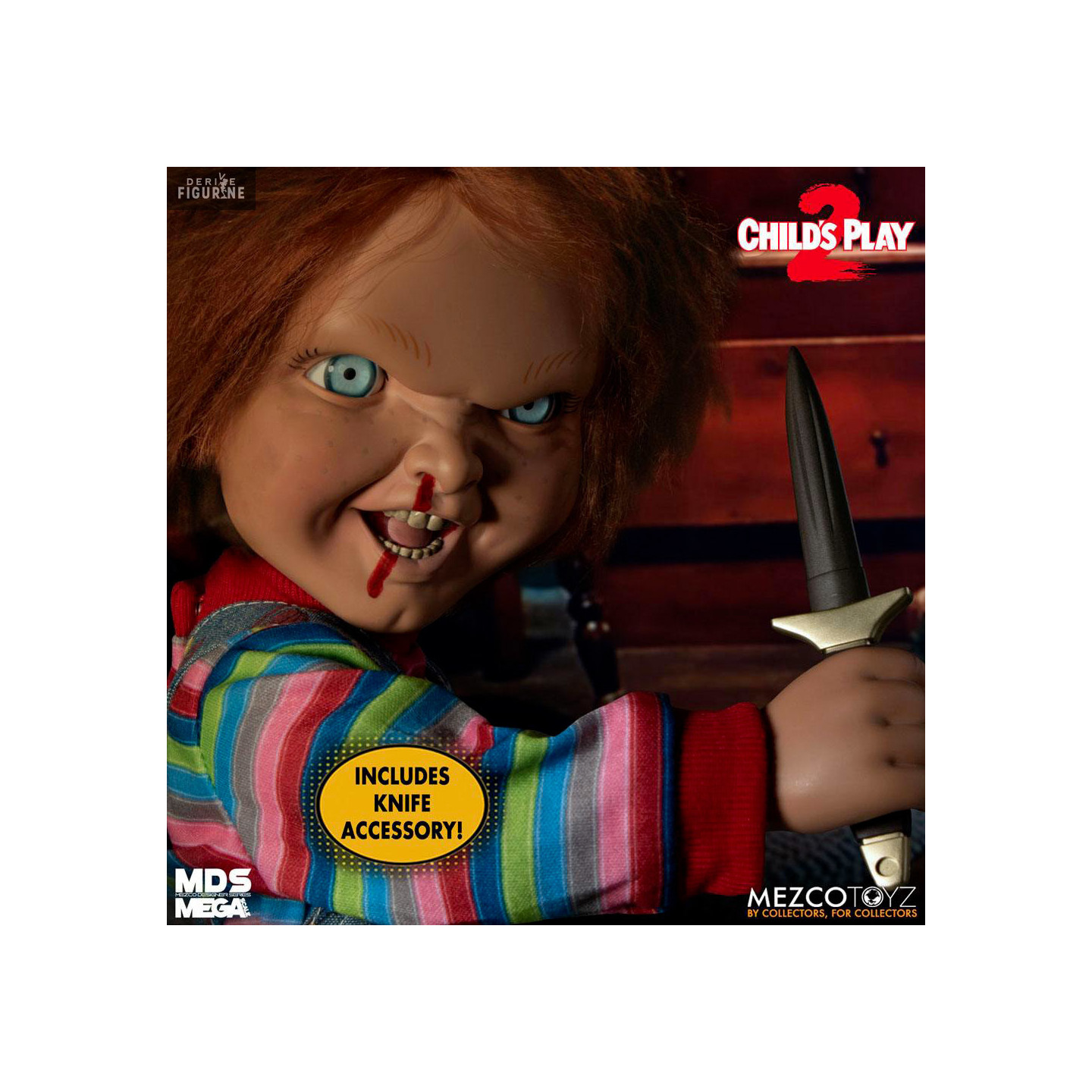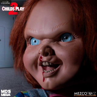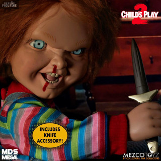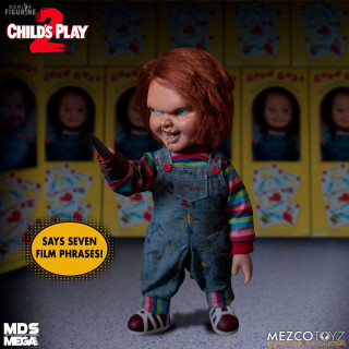 Official figure of Chucky which measures approximately 38 centimeters high. It is from the Mezco Designer Series (MDS) collection. The manufacturer is Mezco Toys.