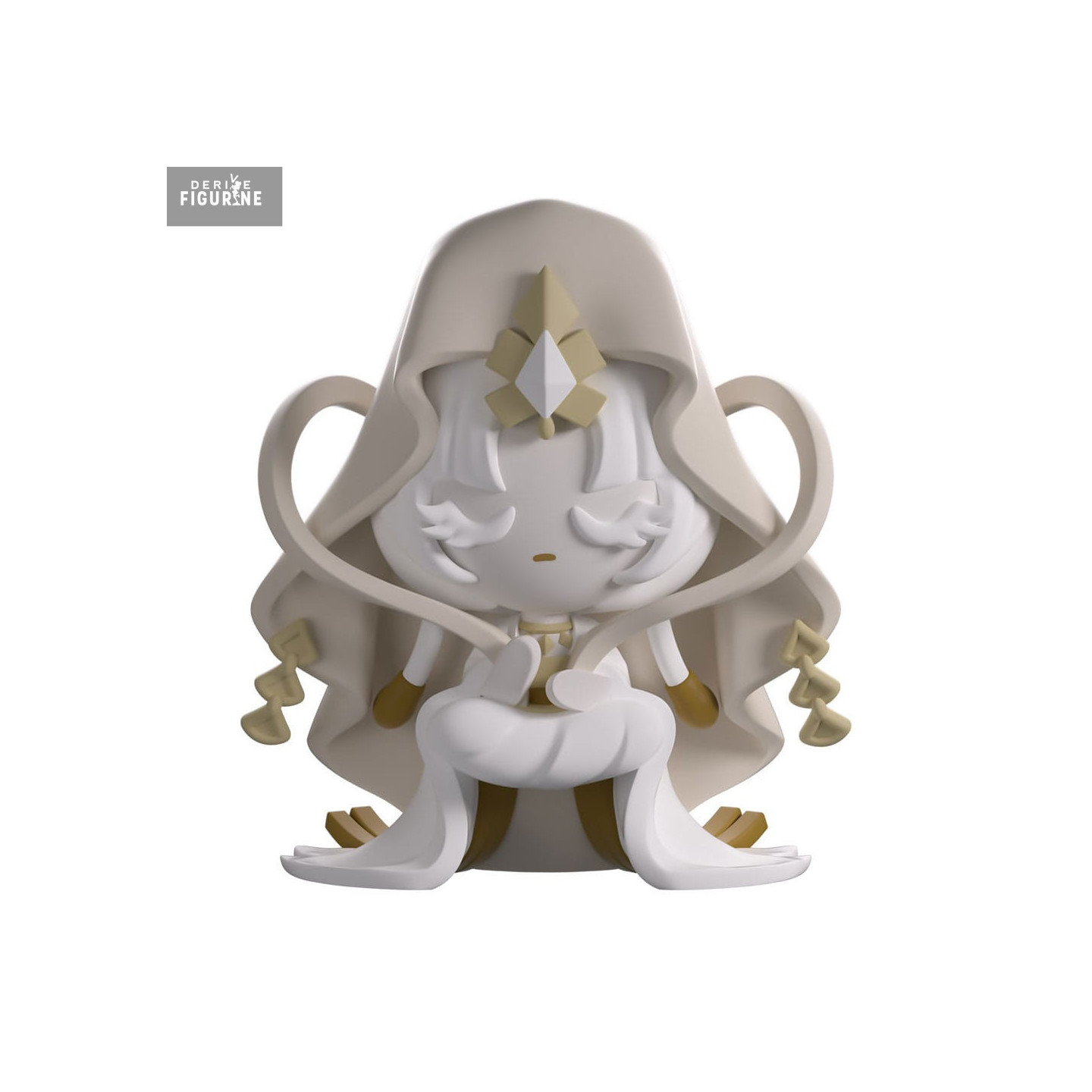 Sculpted details are finely executed: geometric gold patterns on the headdress, smooth flowing lines of the cape and side ribbons, and a matte finish that highlights the contrast between white, beige, and gold. The overall design keeps the clean and refined style of the Cookie Run series.