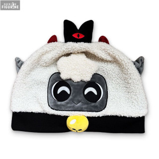 The design faithfully captures Lamb’s features: embroidered half-closed eyes on soft velour, small red horns, and raised white fleece. At the top, the black crown with a purple eye and the yellow bell applique reference the game’s occult emblem, blending playfulness with atmosphere.