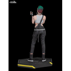 The hexagonal black base features the Cyberpunk 2077 logo in yellow, giving her a grounded and clean presentation. The proportions are realistic, and the sculpt is sharp—especially in the clothing folds, pose, and fine detailing on accessories.