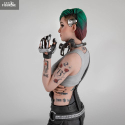 This figure captures her standing confidently with arms crossed, wearing a calm yet perceptive expression. Her in-game look is faithfully recreated: half-shaved hair dyed green and pink, visible tattoos, piercings, a fitted gray tank top, and black pants with chains and cargo details. In one hand, she holds a neural tool, referencing her tech expertise.
