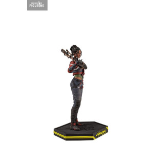 The figure stands on a black hexagonal base stamped with the yellow Cyberpunk 2077 logo. The contrast between her warm-toned outfit and the dark base highlights her powerful, grounded presence. The sculpt is realistic and captures her assertive posture perfectly.