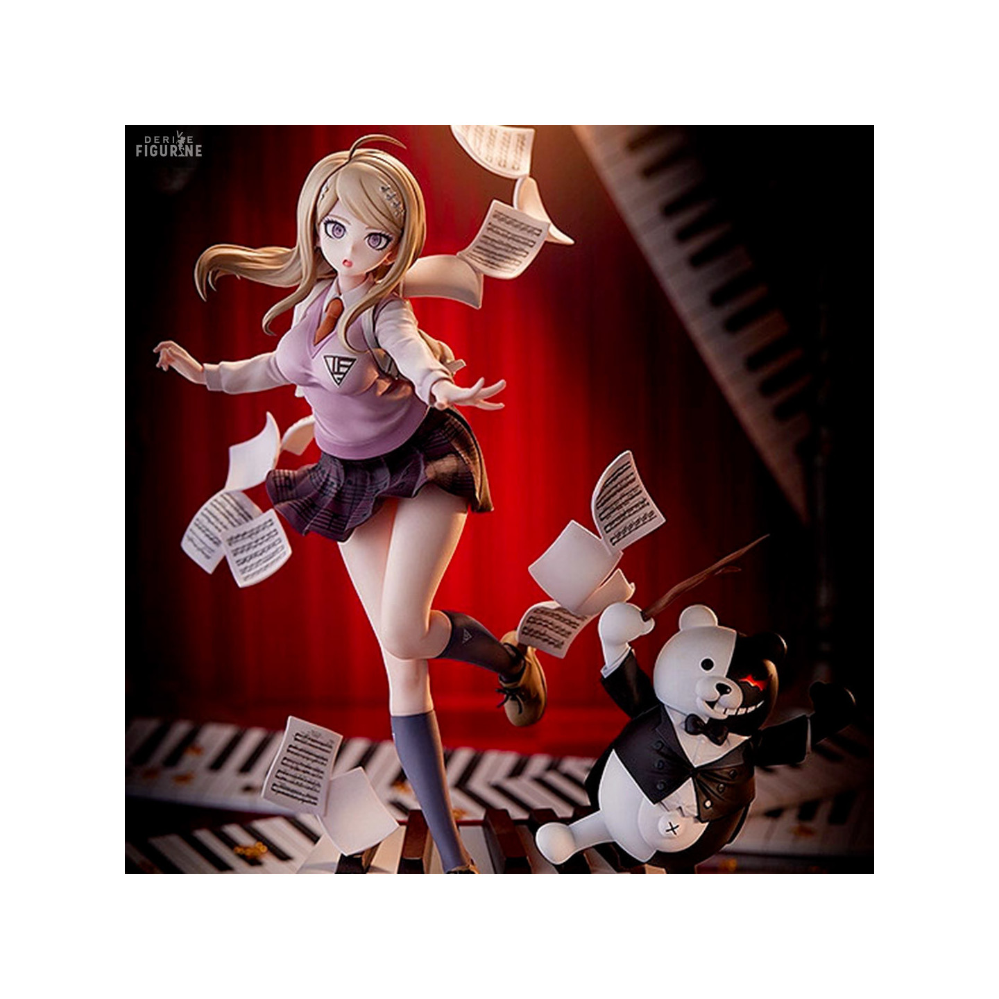 Danganronpa V3: Killing Harmony features many talents including the ultimate pianist by the sweet name of Kaede Akamatsu. Unfortunately for her, Monokuma will go through this when she is found guilty of a crime and he will stage his famous punishments (killing) and this diorama figurine where we see the beautiful Kaede with Monokuma walking on piano notes and stakes flying through the air is drawn.