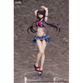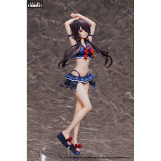 This figure depicts Kurumi in a summer-themed style. Her look is both cute and alluring, dressed in a navy blue bikini with red accents. Her expression is both playful and provocative, typical of the character, with her long black hair flowing gracefully around her. Her distinctive eyes—one red and the other golden—are finely reproduced, adding depth and mystery to this figure. The design of her bikini subtly recalls her traditional sailor uniform, featuring small details like the red bow and ruffles on the skirt. She stands with her arms raised above her head, exuding a carefree yet determined attitude.