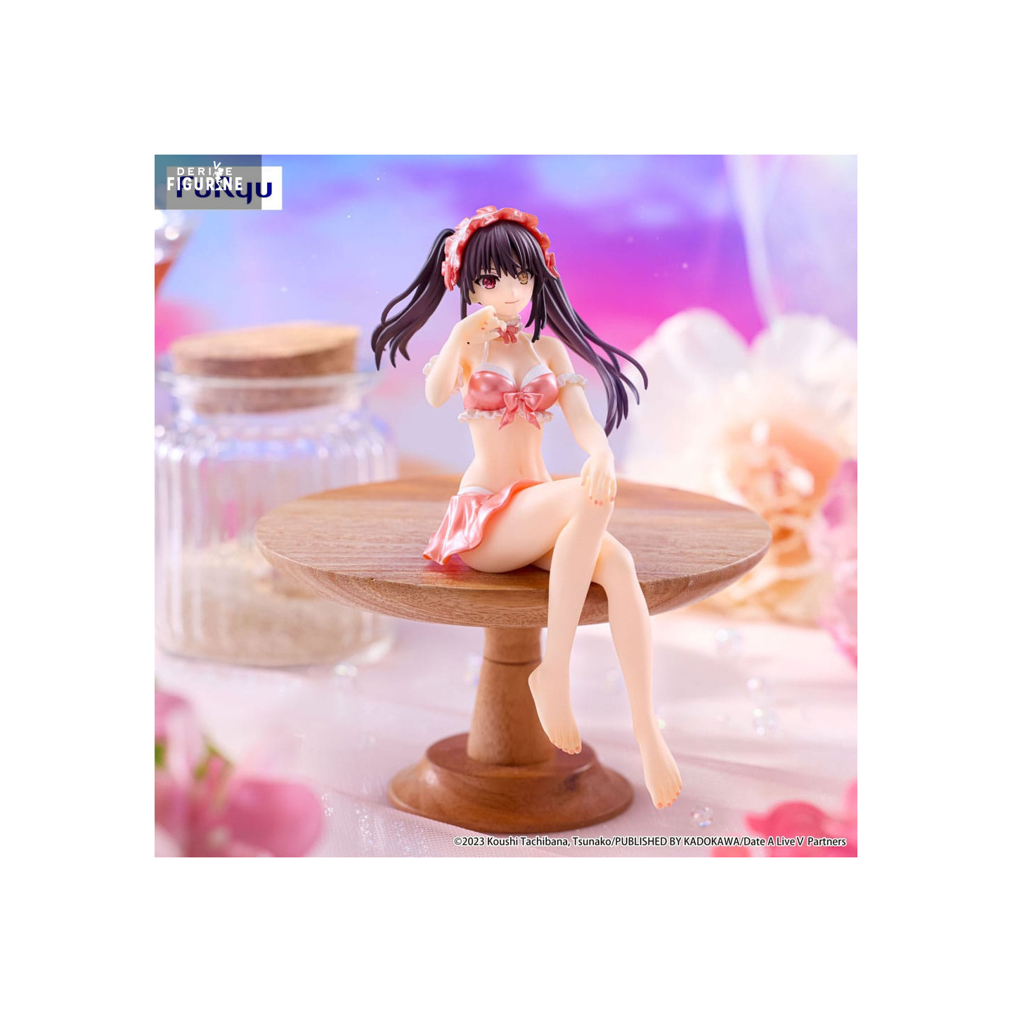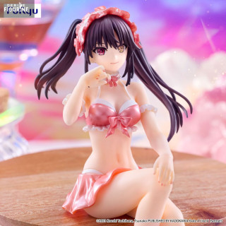 Official figure of Kurumi Tokisaki, Swimsuit Pastel Red Color in PVC which measures approximately 15 centimeters high. It is from the Noodle Stopper collection. The manufacturer is FuRyu.